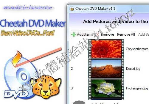 Cheetah DVD Maker是一款DVD刻錄軟體。支援格式有JPG, BMP, FLV, AVI, DivX, WMV